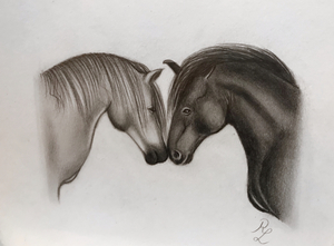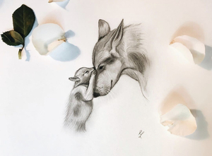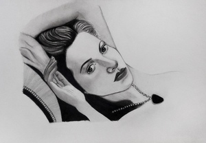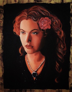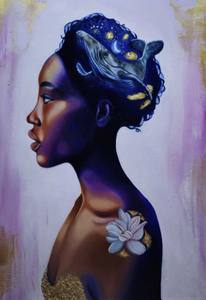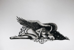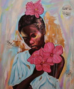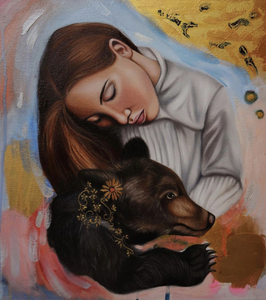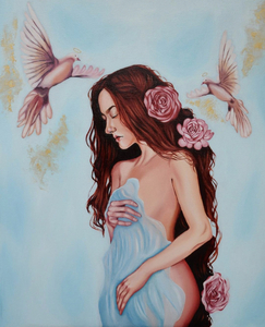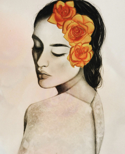 Portretten of figuratieve tekeningen, schilderijen van jonge vrouwen gecombineerd met bloemen en/of dieren in een surrealistische, realistische abstracte stijl.